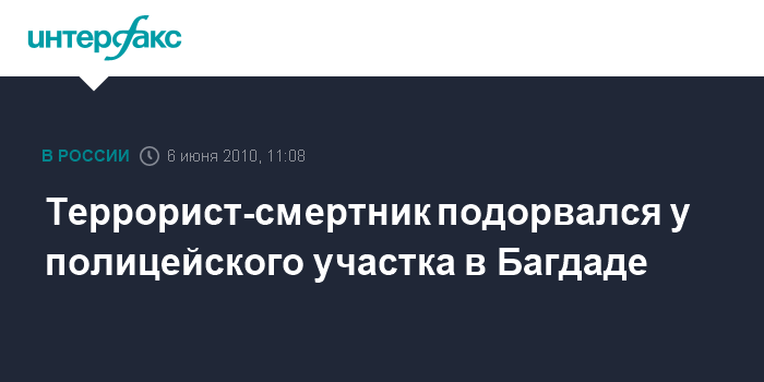 Лондон. 6 июня. INTERFAX.RU - В Багдаде, в западном районе Амил, около полицейского участка прогремел взрыв. Автомобиль, управляемый смертником, въехал в толпу полицейских, когда те заступали на смену, сообщает в воскресенье британская телерадиовещательная компания Би-би-си. В результате взрыва погибли несколько человек, из которых как минимум двое - полицейские.