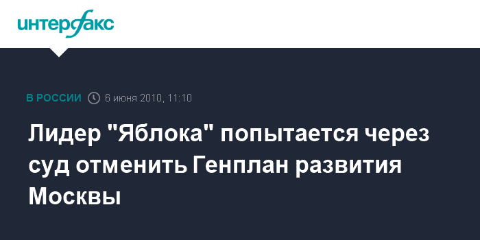 Москва. 6 июня. INTERFAX.RU - Лидер "Яблока" Сергей Митрохин в 10 утра понедельника подаст в Мосгорсуд заявление об оспаривании Генерального плана развития Москвы, сообщили "Интерфаксу" в пресс-службе партии. "Заключение государственной экспертизы было подписано 22 декабря 2009 года - через месяц после внесения проекта в Мосгордуму. Одного этого факта достаточно для отмены, но в заявлении мы указываем на целый ряд нарушений процедуры", - приводятся в сообщении слова самого С.Митрохина.