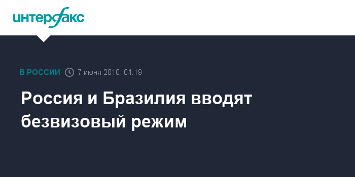 Москва. 7 июня. ИНТЕРФАКС - Режим безвизовых поездок между Россией и Бразилией начнет действовать с 7 июня.