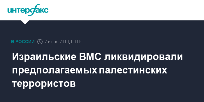 Москва. 7 июня. INTERFAX.RU - Израильские ВМС объявили об уничтожении в понедельник утром четверых предполагаемых палестинских террористов у берегов сектора Газа, сообщает веб-сайт газеты "Гаарец".