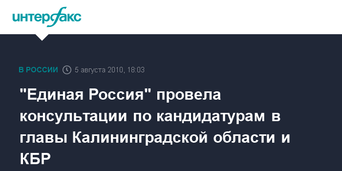 Москва. 5 августа. INTERFAX.RU - Представители руководства "Единой России" во главе с председателем высшего совета партии, спикером Госдумы Борисом Грызловым провели консультации с уполномоченным президента РФ, первым заместителем руководителя администрации президента Владиславом Сурковым по выдвижению кандидатур на должности глав исполнительной власти Калининградской области и Кабардино-Балкарской республики.