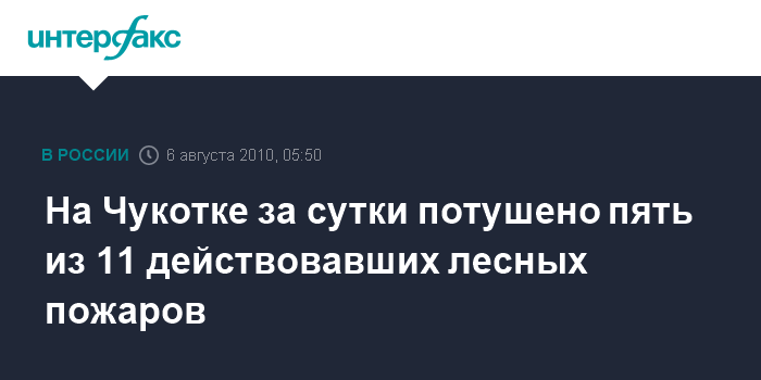 Анадырь. 6 августа. ИНТЕРФАКС-ДАЛЬНИЙ ВОСТОК - Спасателям и добровольцам на Чукотке удалось справиться с пятью из 11 действовавших лесных и тундровых пожаров на площади около 40,5 тыс. гектаров.