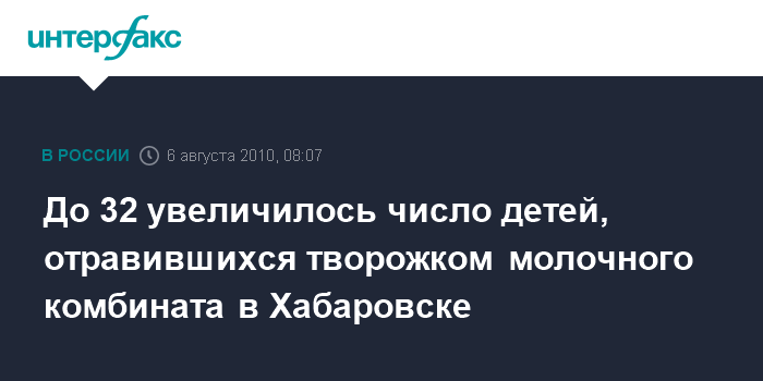 Москва. 6 августа. INTERFAX.RU - В Хабаровске увеличилось до 32 общее количество пострадавших от пищевой токсикоинфекции детей, сообщили агентству "Интерфакс-Дальний Восток" в управлении Роспотребнадзора по Хабаровскому краю в пятницу.