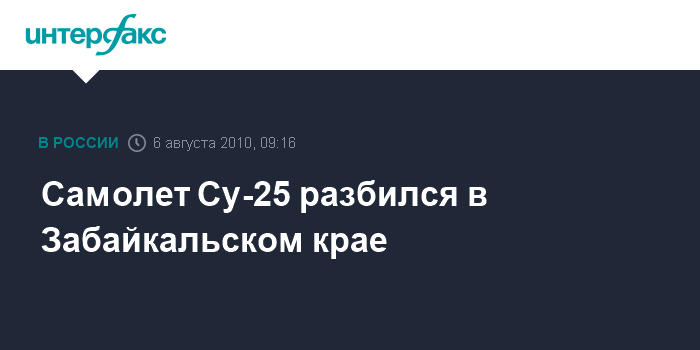 Москва. 6 августа. INTERFAX.RU - Штурмовик Су-25 УБ (учебно-боевой) ВВС России разбился во время перелета из аэродрома "Степь" на аэродром "Домна" в Забайкальском крае в 7:30 мск.
