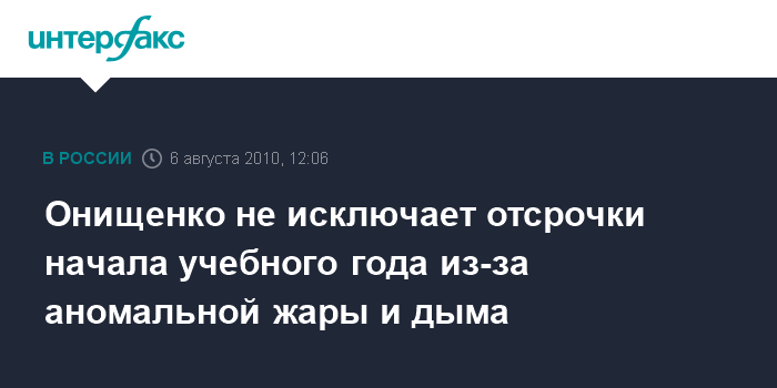 Москва. 6 августа. INTERFAX.RU - Роспотребнадзор рассчитывает, что начало учебного года в России не нужно будет переносить, и аномальная жара спадет после второй декады августа. "Возможно, мы такой вопрос (о переносе начала учебного года) поставим. Но я все-таки надеюсь, опираясь на данные Гидрометеорологической службы, что все-таки эта аномально высокая температура закончится у нас с вами по окончании второй декады августа, за оставшиеся 10 дней воздух очистится и наши дети пойдут в школу 1 сентября", - сказал глава Роспотребнадзора, главный государственный санитарный врач РФ Геннадий Онищенко журналистам в Москве в пятницу. При этом он заявил, что если жара и сильное задымление сохранится, то Роспотребнадзор в отдельных городах, в частности, в Москве, может поставить вопрос о переносе начала занятий в школах.