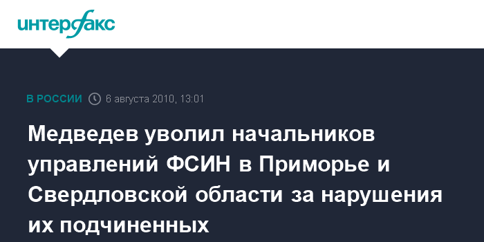 Медведев уволил начальников управлений ФСИН в Приморье и Свердловской области за нарушения их подчиненных
