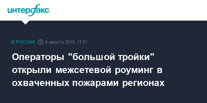 Москва. 6 августа. INTERFAX.RU - Сотовые операторы ОАО "Мобильные Телесистемы" (МТС), ОАО "Вымпелком" и ОАО "Мегафон" открыли межсетевой роуминг во всех регионах РФ, где объявлена чрезвычайная ситуация в связи с пожарами, сообщили "Интерфаксу" в компаниях.