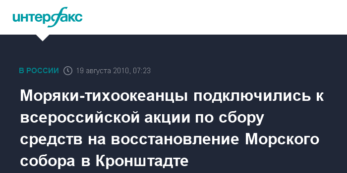 Владивосток. 19 августа. ИНТЕРФАКС-ДАЛЬНИЙ ВОСТОК - На Тихоокеанском флоте (ТОФ) начался сбор средств в рамках всероссийской акции по восстановлению Морского храма на Якорной площади в Кронштадте.
