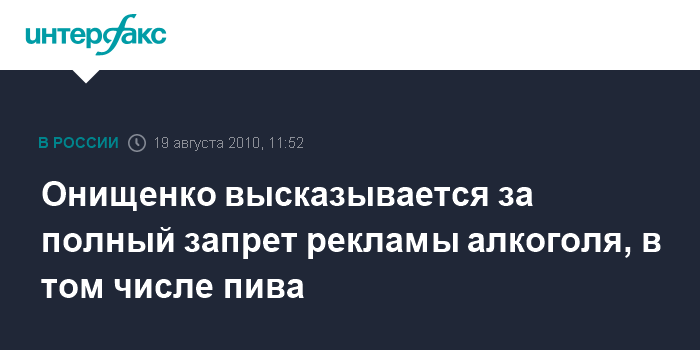 Москва. 19 августа. INTERFAX.RU - Глава Роспотребнадзора Геннадий Онищенко предлагает полностью запретить рекламу алкоголя и пива.
