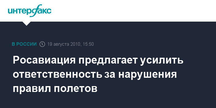 Москва. 19 августа. INTERFAX.RU - Росавиция предлагает усилить административную и уголовную ответственность за нарушения правил использования воздушного пространства, говорится в сообщении Росавиации.