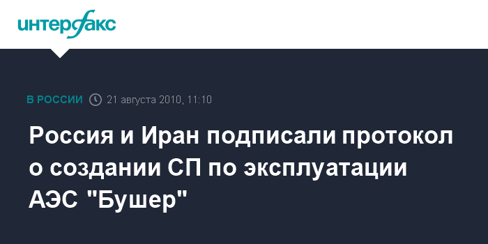 Бушер (Иран). 21 августа. INTERFAX.RU - Россия и Иран подписали протокол о создании совместного предприятия по эксплуатации АЭС в Бушере, физпуск которой начался в субботу, передает корреспондент "Интерфакса" с площадки станции. Документ подписали глава ЗАО "Атомстройэкспорт" Дан Беленький и глава "Nuclear Power Production and Development" (NPPD) Махмуд Ахмадьян. СП будет создано на паритетных началах.
