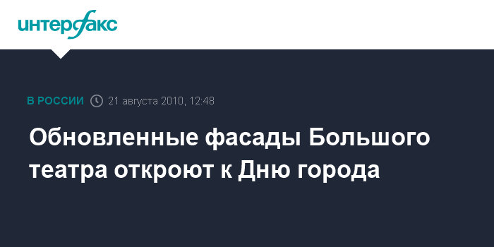 Москва. 21 августа. INTERFAX.RU - Полностью освобожденные от строительных лесов главный и боковые фасады Большого театра с ночной подсветкой, а также отреставрированная квадрига предстанут перед москвичами и гостями столицы к Дню города, который в этом году отмечается 4-5 сентября. "К дню города будут доступны все фасады и сама Театральная площадь", - сообщил журналистам в субботу первый заместитель мэра столицы Владимир Ресин.
