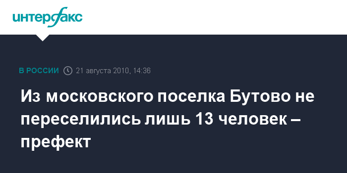Москва. 21 августа. INTERFAX.RU - Из 611 собственников домов в поселке Бутово на юго-западе Москвы 598 уже переехали, а с остальными 13 продолжается диалог о предоставлении жилья, сообщил префект Юго-Западного административного округа столицы Алексей Челышев.