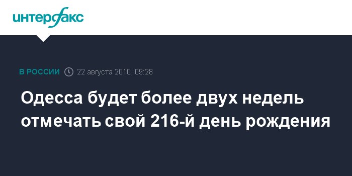 Одесса. 22 августа. ИНТЕРФАКС-УКРАИНА - Мероприятия по случаю празднования 216-й годовщины со дня основания Одессы будут длиться 16 дней - с 26 августа по 10 сентября, сообщает Управление информации Одесского городского совета.