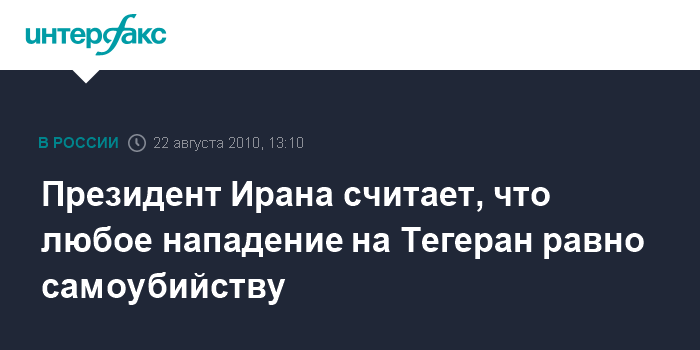 Тегеран. 22 августа. INTERFAX.RU - Любая попытка нападения на Иран является военным самоубийством, заявил президент Ирана Махмуд Ахмадинежад. "Даже самые наивные американские политики считают, что любая попытка нападения на Иран равна военному самоубийству", - сказал президент, выступая перед профессорами университетов страны в минувшую субботу.
