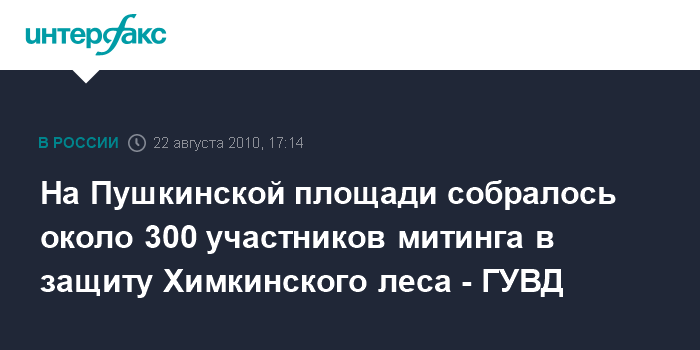 Москва. 22 августа. INTERFAX.RU - По официальным данным ГУВД, на митинг в защиту Химкинского леса, который проходит на Пушкинской площади в центре Москвы, пришло около 300 человек. Такие данные "Интерфаксу" привели в ГУВД российской столицы в воскресенье.