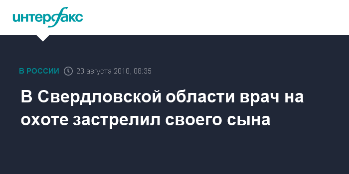 Екатеринбург. 23 августа. INTERFAX.RU - В Свердловской области в пятницу вечером в лесном массиве, расположенном в 10 км от села Новоипатово Сысертского района, врач местной городской больницы в результате неосторожного выстрела смертельно ранил собственного сына 1993 г. рождения.
