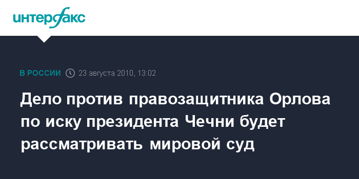 Москва. 23 августа. INTERFAX.RU - Уголовное дело против главы российского правозащитного центра "Мемориал" Олега Орлова, которого обвиняют в клевете на президента Чечни Рамзана Кадырова, будет рассматривать мировой судья Хамовнического района Москвы, сообщил в понедельник "Интерфаксу" адвокат правозащитника Генри Резник.