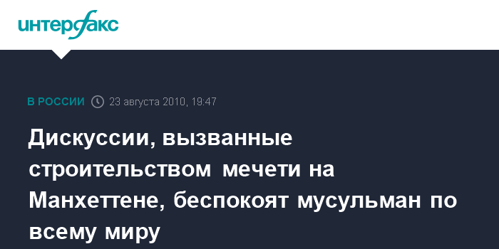 Вашингтон. 23 августа. INTERFAX.RU - Мусульмане всего мира обеспокоены проблемой строительства мечети в Нью-Йорке, в непосредственной близости от "точки ноль", где до 11 сентября 2001 года стояли башни Всемирного торгового центра, пишет в понедельник американская газета Los Angeles Times.