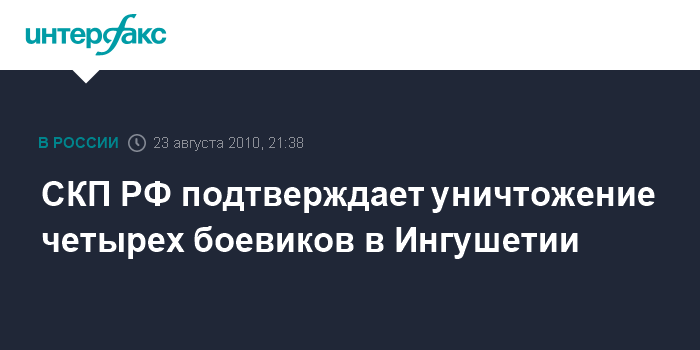 Назрань. 23 августа. INTERFAX.RU - Официальный представитель СКП РФ по Ингушетии подтвердил агентству "Интерфакс", что в Назрани ликвидированы четыре члена незаконных вооруженных формирований.