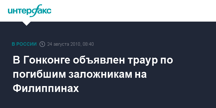 Москва. 24 августа. INTERFAX.RU - В Гонконге объявлен траур по убитым на Филиппинах туристам: в результате спецоперации по освобождению заложников, которую провел филиппинский спецназ, погибли восемь человек, еще семеро - госпитализированы.