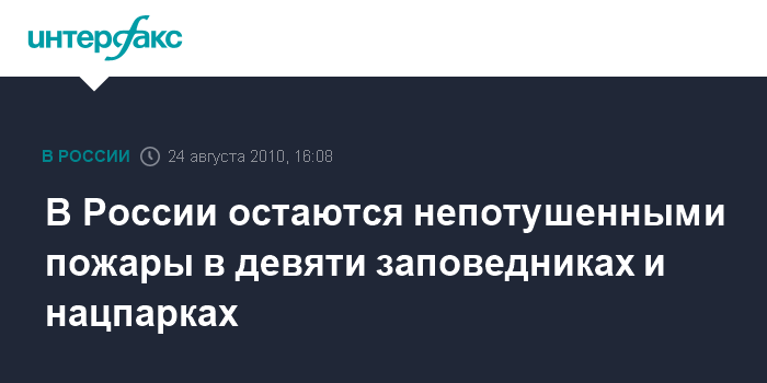 Москва. 24 августа. INTERFAX.RU - В РФ, по состоянию на 24 августа, в 9 заповедниках и национальных парках действует 19 пожаров, из них 17 очагов локализовано, сообщает во вторник пресс-служба Минприроды России.