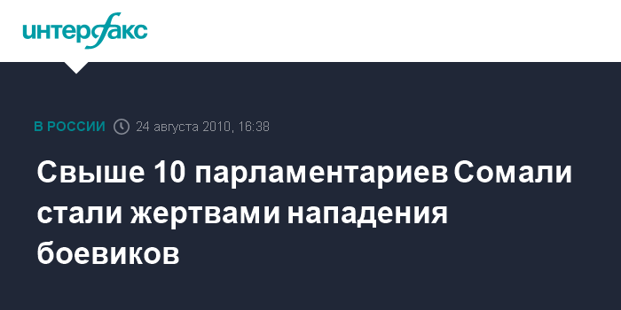 Тегеран. 24 августа. ИНТЕРФАКС - Более десяти сомалийских парламентариев были убиты во вторник в результате нападения боевиков террористической организации "Аш-Шабаб" на один из отелей в Могадишо, сообщает иранский телеканал Press TV.