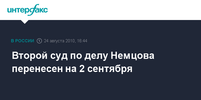 Москва. 24 августа. INTERFAX.RU - Заседание второго суда по делу сопредседателя оппозиционного движения "Солидарность" Бориса Немцова, которое должно было состояться во вторник в 16:00 в одном из подразделений Замоскворецкого суда, перенесено на следующую неделю.