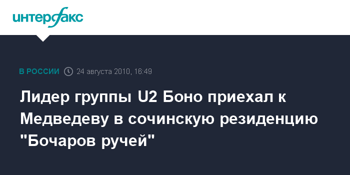 Сочи. 24 августа. INTERFAX.RU - Президент РФ Дмитрий Медведев за чашкой чая встретился во вторник с лидером ирландской группы U2 Боно, концерт которой состоится в Москве 25 августа.