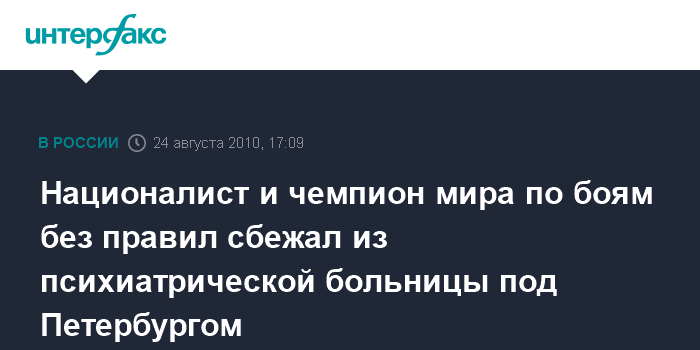 Санкт-Петербург. 25 августа. INTERFAX.RU - Милиция Петербурга разыскивает Вячеслава Дацика - активиста "Славянского союза" и чемпиона мира по боям без правил, сбежавшего из психиатрической больницы.