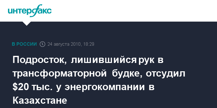 Караганда. 24 августа. INTERFAX.RU - Районный суд в Караганде (Казахстан) обязал местную энергокомпанию "Караганды Жарык" выплатить 14-летнему подростку 3 млн тенге (147,2/$1).