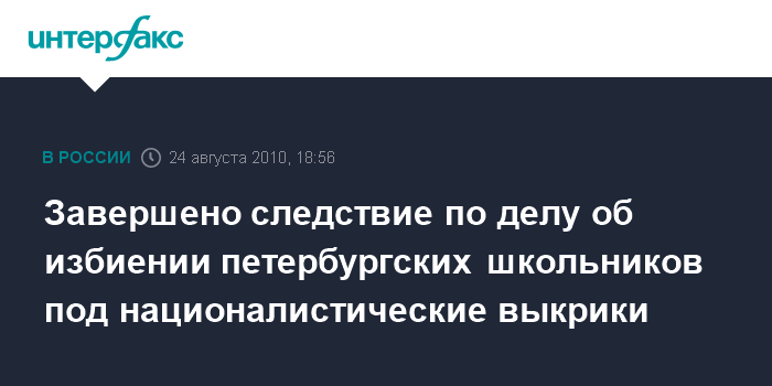 Санкт-Петербург. 24 августа. INTERFAAX.RU - Завершилось следствие по делу школьников Тагира Керимова и Сулеймана Рамазанова, избитых под националистические выкрики в Петербурге, сообщили "Интерфаксу" в Следственном управлении СКП по северной столице.