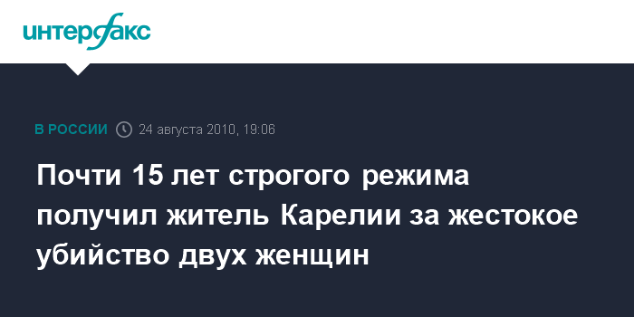 Петрозаводск. 24 августа. INTERFAX.RU - В Карелии к длительному сроку приговорен местный житель, совершивший убийство двух женщин с особой жестокостью, сообщает во вторник республиканский СКП.
