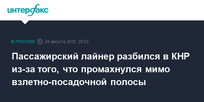Пекин. 24 августа. INTERFAX.RU - Самолет с более чем 90 пассажирами на борту проскочил мимо взлетно-посадочной полосы при ночной посадке в аэропорте Линьду города Ичунь северо-восточной китайской провинции Хэйлунцзян, сообщают во вторник китайские СМИ со ссылкой на управление гражданской авиации провинции.