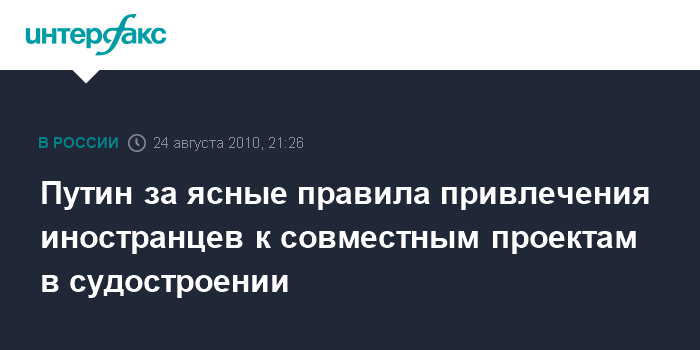 Петропавловск-Камчатский. 24 августа. INTERFAX.RU - Россия должна создать ясные и понятные правила, чтобы привлечь иностранные компании, занимающиеся судостроением, к совместному производству, заявил премьер-министр РФ Владимир Путин.