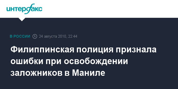 В понедельник бывший офицер филиппинской полиции Роландо Мендоса, вооруженный автоматической винтовкой, захватил автобус с 25 туристами из Гонконга. В ходе переговоров бывший полицейский отпустил нескольких человек, заявив, что требует вернуть ему работу. Однако филиппинским властям не удалось договориться с захватчиком. После 10-часового противостояния спецназ начал штурм автобуса, в ходе которого Р.Мендоса был убит.