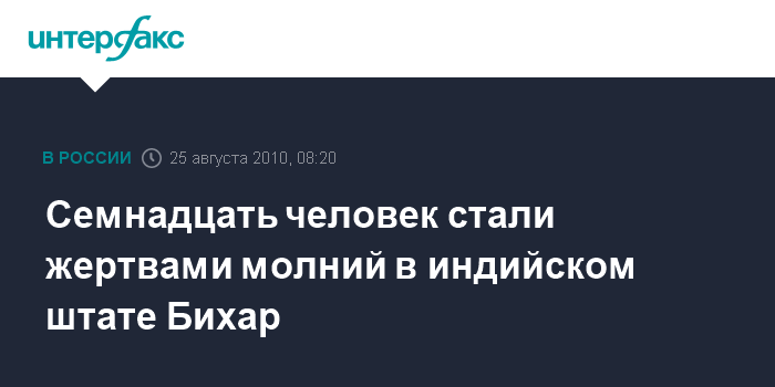 Дели. 25 августа. INTERFAX.RU - Семнадцать человек были убиты разрядами молний и свыше двух десятков получили серьезные ожоги в индийском штате Бихар во время проливного дождя минувшей ночью.