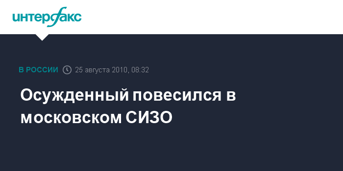 Москва. 25 августа. INTERFAX.RU - В СИЗО на северо-западе Москвы осужденный покончил жизнь самоубийством, сообщил "Интерфаксу" источник в правоохранительных органах в среду.