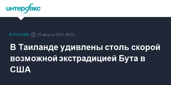 Бангкок. 25 августа. INTERFAX.RU - Столь скорая возможная экстрадиция россиянина Виктора Бута в США удивила многих представителей таиландских властей, пишет в среду таиландская газета Bangkok Post, отмечая, что пока неизвестно, "кто срежиссировал такой сценарий".