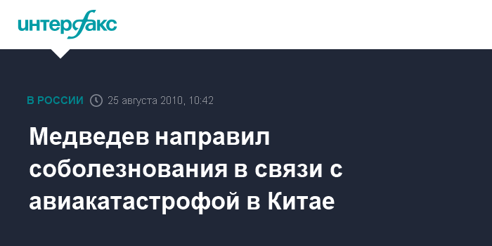 Москва. 25 августа. INTERFAX.RU - Президент России Дмитрий Медведев выразил соболезнования председателю Китайской народной республики Ху Цзиньтао в связи с авиакатастрофой в городе Ичунь, сообщает в среду пресс-служба главы государства.