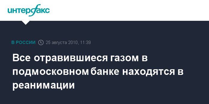 Москва. 25 августа. INTERFAX.RU - Все пострадавшие от действия газифицированной системы пожаротушения в одном из банков в Подольске находятся в реанимации, сообщили в центральной больнице города.