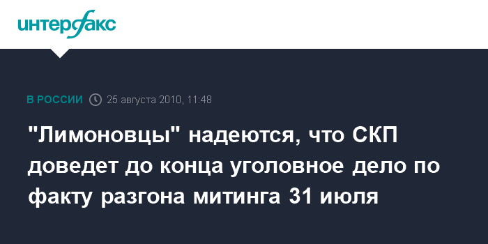 Санкт-Петербург. 25 августа. INTERFAX.RU - Сторонники Эдуарда Лимонова, которым милиция не позволила провести 31 июля акцию у Гостиного Двора Петербурга, воодушевлены решением СКП возбудить уголовное дело по факту разгона митинга.