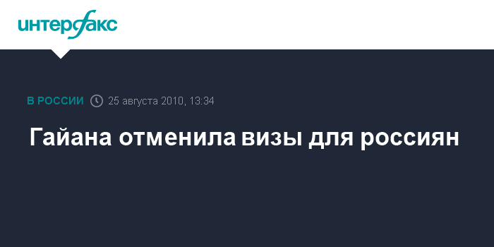 Москва. 25 августа. INTERFAX.RU - Власти Республики Гайана в одностороннем порядке с 1 августа 2010 года отменили визовые формальности для российских граждан для въезда на территорию страны, сообщается на официальном сайте Министерства иностранных дел РФ.