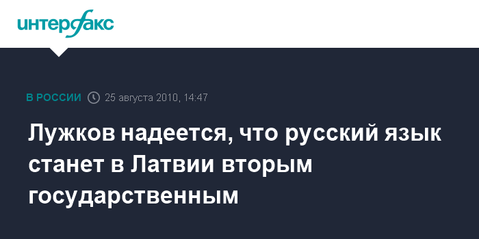 Рига. 25 августа. INTERFAX.RU - Мэр Москвы Юрий Лужков, встречаясь в среду в Риге с российскими соотечественниками, выразил уверенность, что придет время, когда русский язык станет в Латвии вторым государственным.