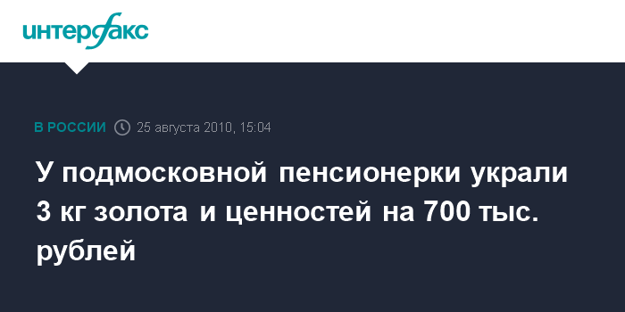 Москва. 25 августа. INTERFAX.RU - Ценности и деньги на 700 тыс. рублей и три золотых слитка похитили неизвестные из квартиры пенсионерки в Подмосковье, сообщает ГУВД по Московской области.