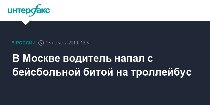 Москва. 25 августа. INTERFAX.RU - Агрессивный владелец иномарки, расколотивший бейсбольной битой окна в троллейбусе, задержан на юго-западе Москвы.
