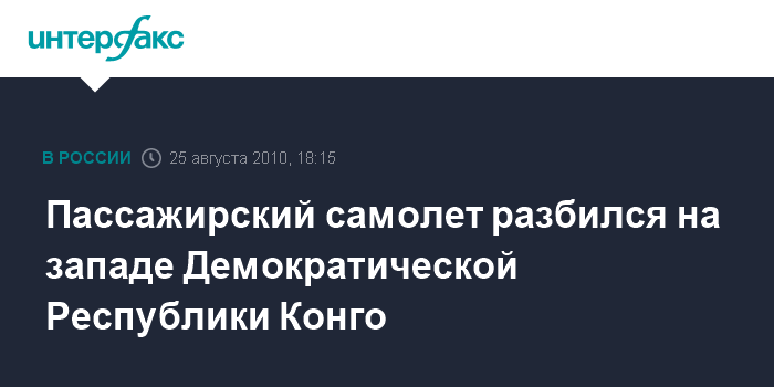 Лондон. 25 августа. INTERFAX.RU - Пассажирский самолет в среду потерпел крушение на западе Демократической Республики Конго (ДРК), 19 человек погибли, двоим удалось выжить, сообщает BBC.