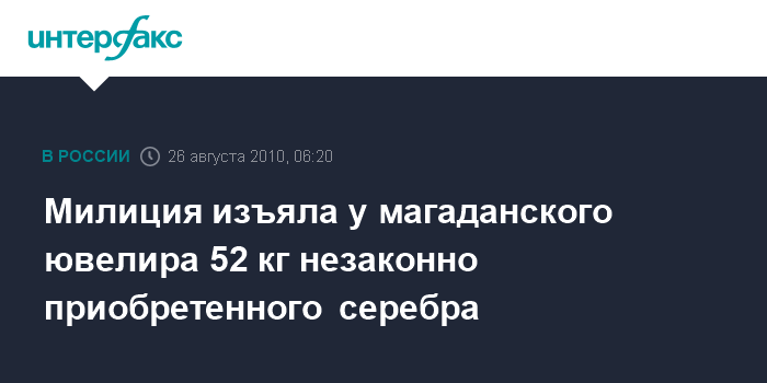 Магадан. 26 августа. ИНТЕРФАКС-ДАЛЬНИЙ ВОСТОК - Оперативники Магаданской области в рамках проводимой спецоперации "Самородок-2010" изъяли у местного ювелира три мешка незаконно приобретенного серебра общим весом 52 кг.