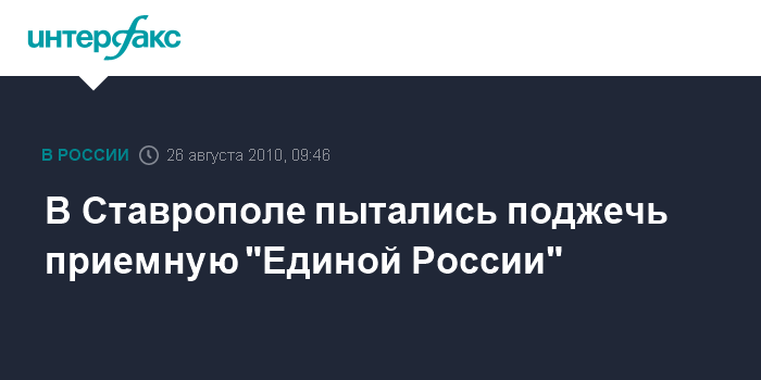 Москва. 26 августа. INTERFAX.RU - Неизвестные бросили в Ставрополе бутылку с горючей смесью в здание, где находится общественная приемная партии "Единая Россия".