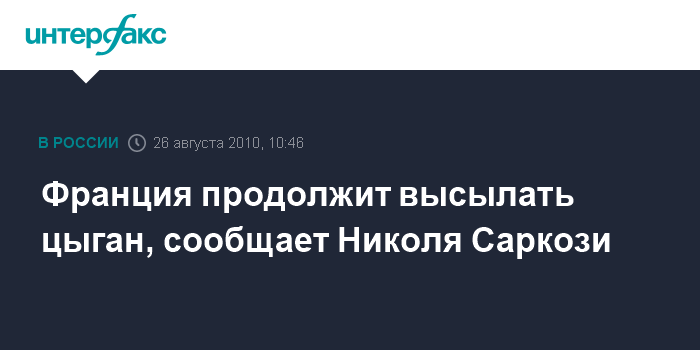 Лондон. 26 августа. INTERFAX.RU - Французский президент Николя Саркози сообщил, что власти страны продолжат проводить высылку цыган, нелегально проживающих на территории Франции, передает в четверг британская телерадиокорпорация BBC.
